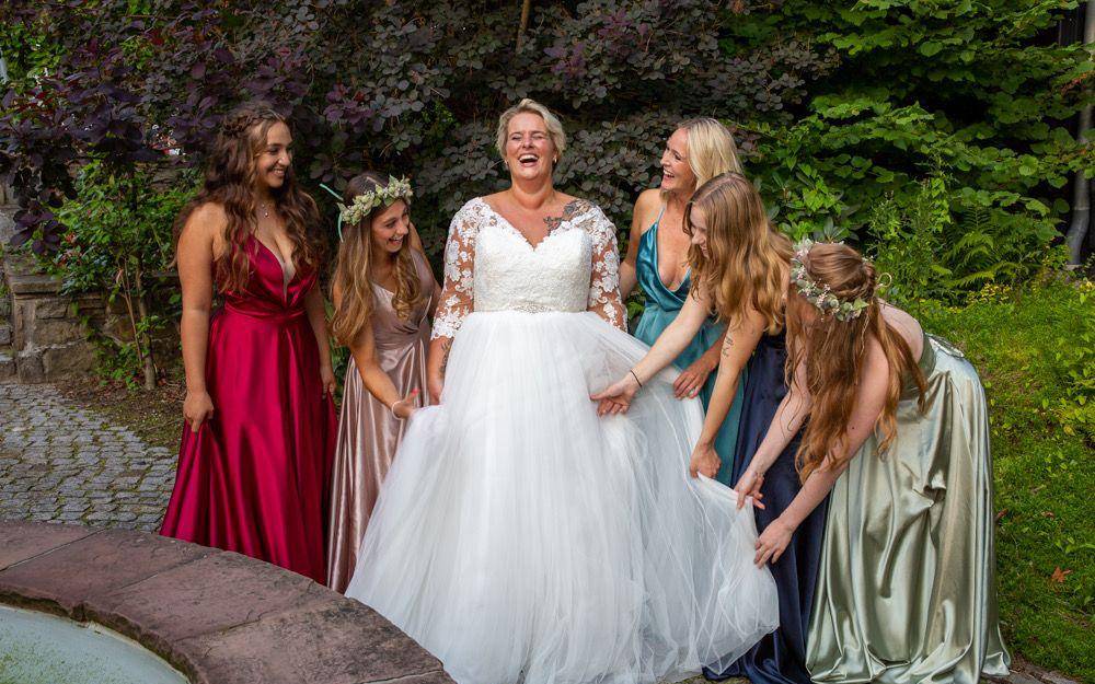 Brautjungfern kannte man früher nur von amerikanischen Hochzeiten. Inzwischen sind diese besonderen Braut-Begleiterinnen aber auch hierzulande häufiger bei Trauungen zu sehen. Auch Meike holt sich zwei Brautjungfern an die Seite und die Kleider dazu gab es von der "Froschkönigin" geschenkt.