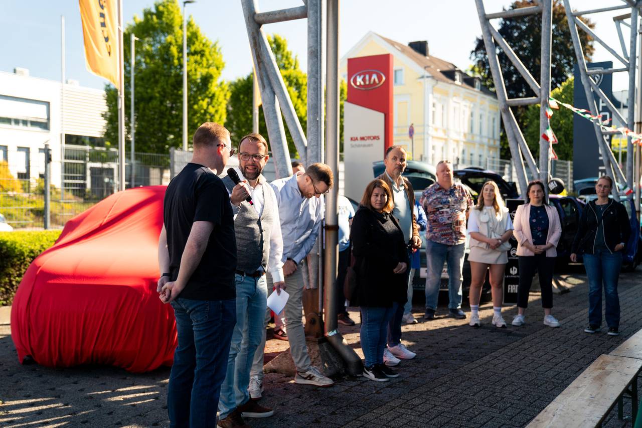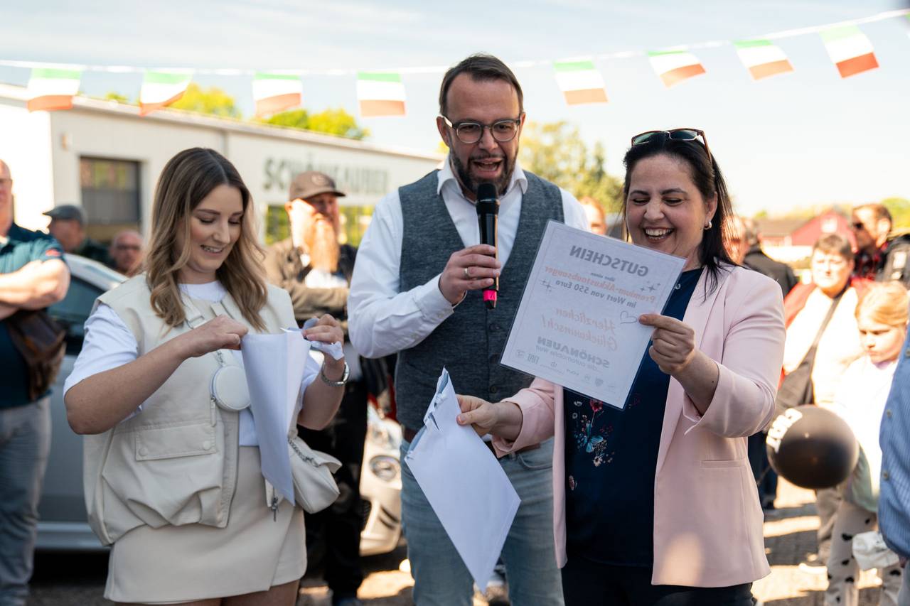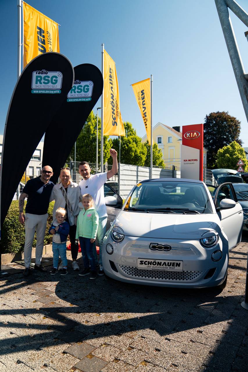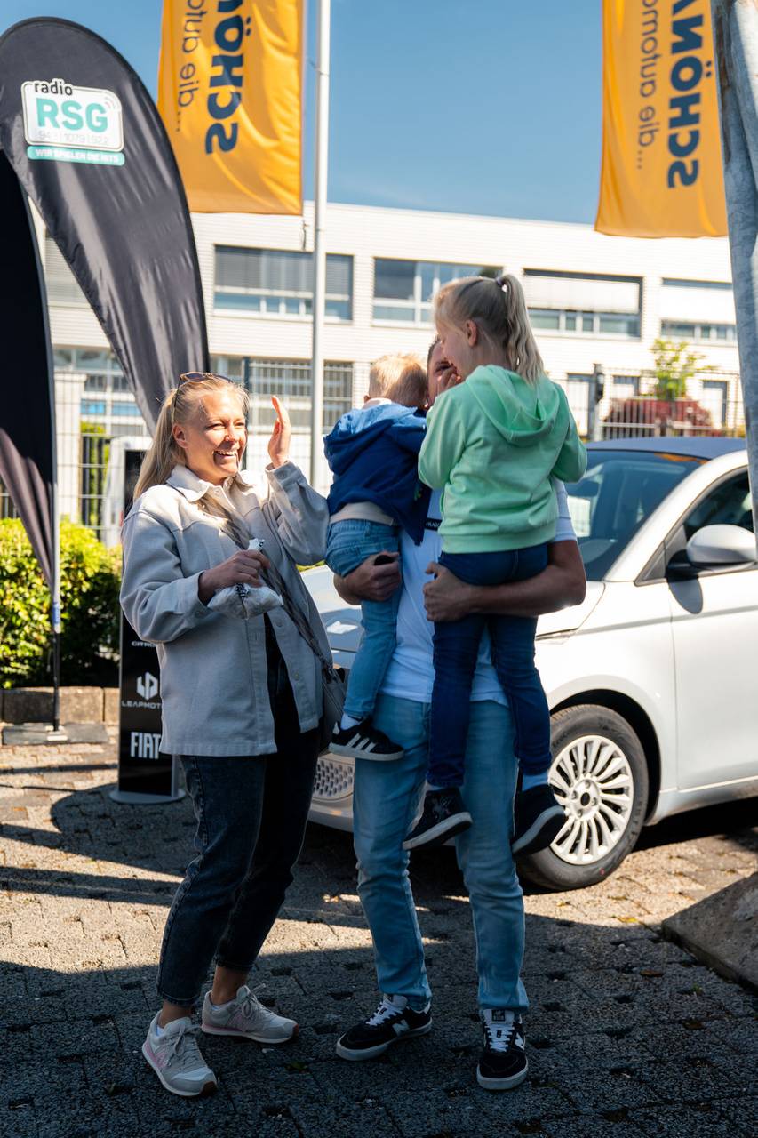 Ein Herzschlagfinale mit Dolce Vita und Familienglück: Manuel aus Solingen gewinnt den himmelblauen Fiat 500 Elektro Cabrio vom Autohaus Schönauen für ein Jahr. Insgesamt 10 RSG-Hörer hatten sich im Radio für das Finale am 10. Mai 2025 bei Schönauen qualifiziert. Hier waren bei mehreren Schätzfragen zunächst ein wenig Italien-Wissen oder Rateglück gefragt, um den Auto einen Schritt näher zu kommen. Spannender ging es kaum: In der alles entscheidenden Runde durften die letzten 3 Finalisten aus 3 Schlüsseln wählen. Manuel musste den Schlüssel nehmen, der noch übrig blieb - doch ausgerechnet das war der passende. Manuel, seine Frau und die Kinder konnten ihr Glück kaum fassen und begrüßten gleich ausgiebig das neue, kultige Familienmitglied. Wir wünschen gute Fahrt mit dem Fiat 500!